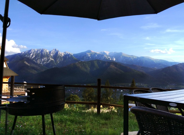 Tam miejsce grillowe z paleniskiem, stół, ławki, parasol ogrodowy. Wszystko to z niepowtarzalnym widokiem na Tatry