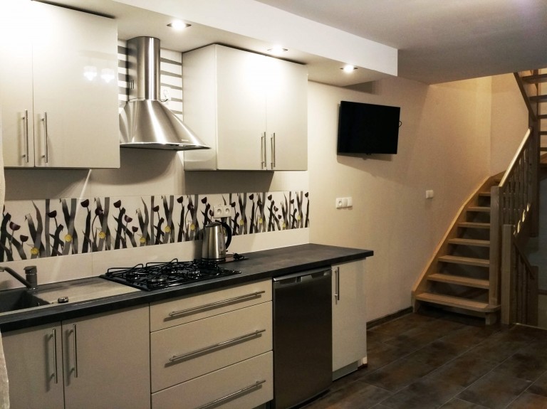 Kuchnia jest w pełni wyposażona: indukcyjna płyta grzewcza, lodówka, zmywarka, kuchenka mikrofalowa, kapsułkowy ekspres do kawy, czajnik elektryczny, akcesoria kuchenne, zastawa.